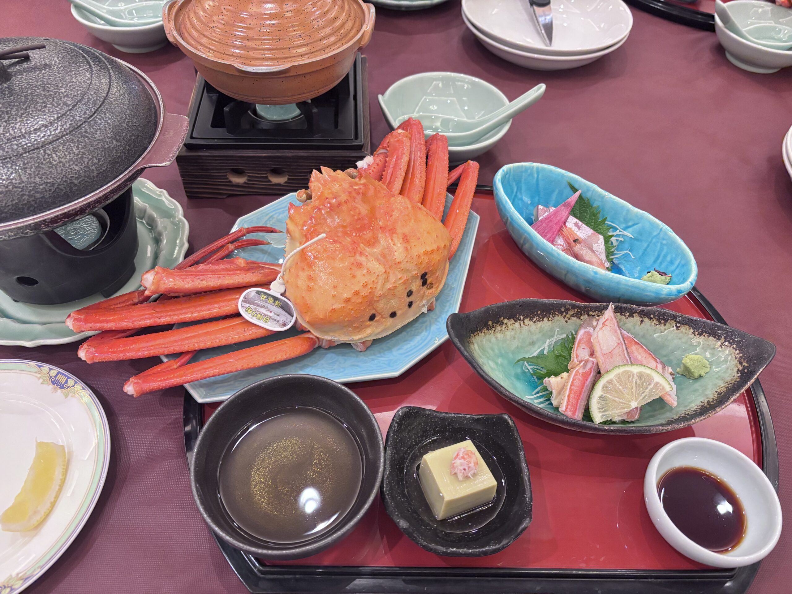 今回予約を取り直したホテルはネット上では満室で、旅行会社の宿泊プランで申し込むことができました。そのためか夕食が17時だったか17時半だったか、とにかく早い開始であわあわ(ランチたくさん食べちゃったので💦)。でも3人でこの蟹づくし、全部平らげたのでした笑。(そして写真は蓋を開けて撮りましょう💦。焼きガニと蟹鍋が入ってました😆)